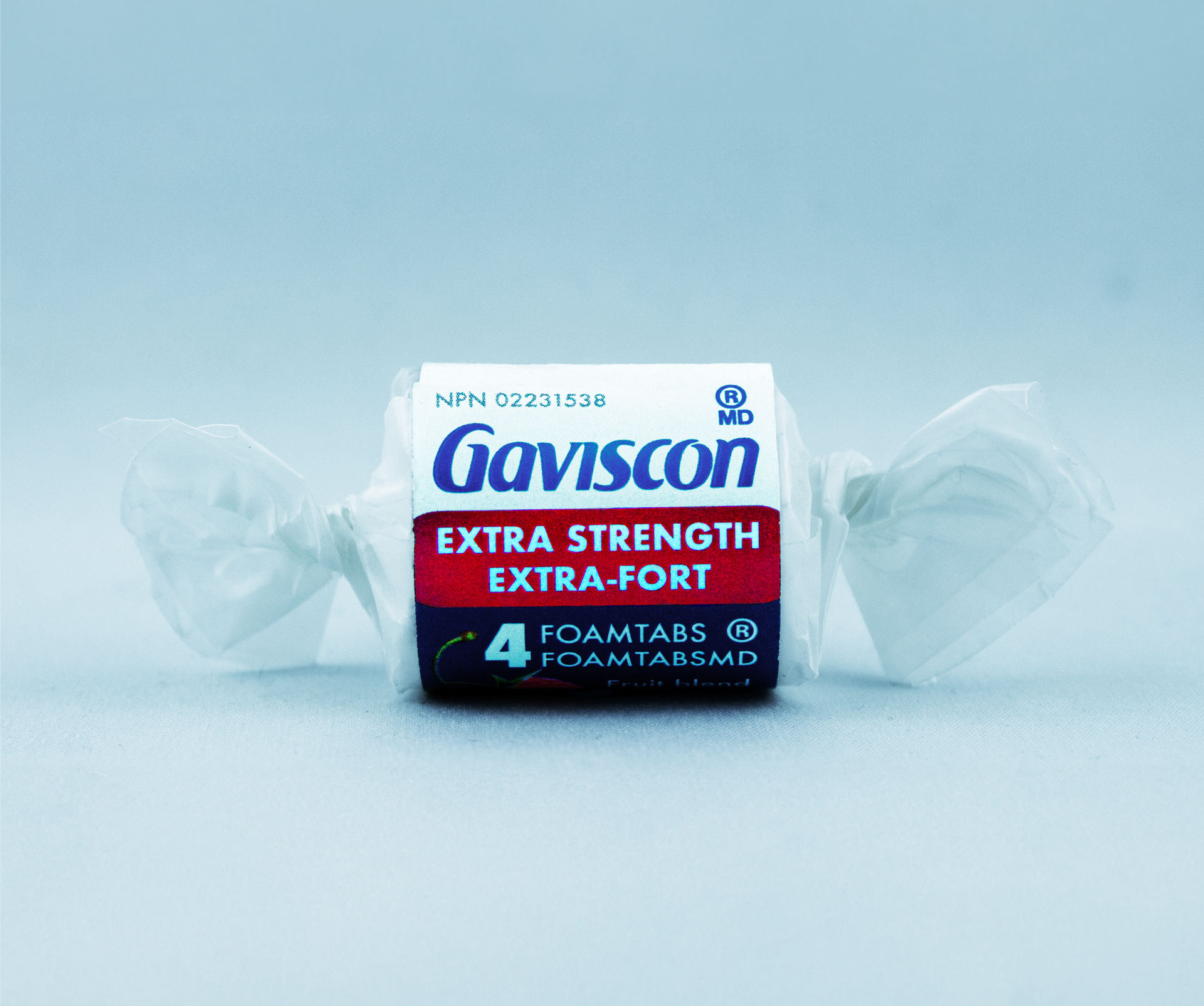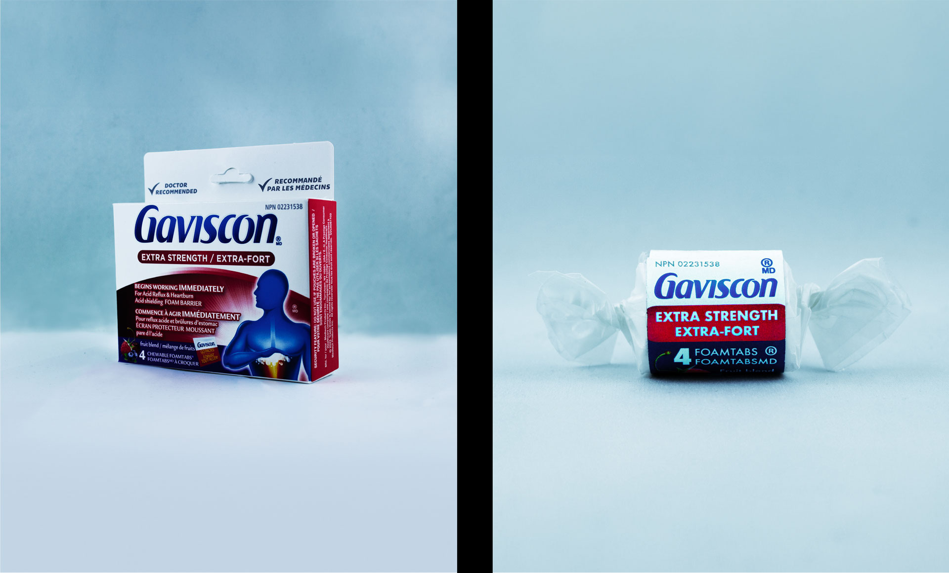 My goal was to reduce the packaging used for a four-tablet Gaviscon pack. The biggest obstacle in this project was the large amount of medical information on the original package. The spirit of this project was to challenge otherwise unchallengeable ideas, so I put the tablets in a polyethylene twist wrap, like candy, and then moved the Gavascon branding to an outer sleeve. The medical information is now on a pamphlet inside the plastic twist wrap looped around the tablets.